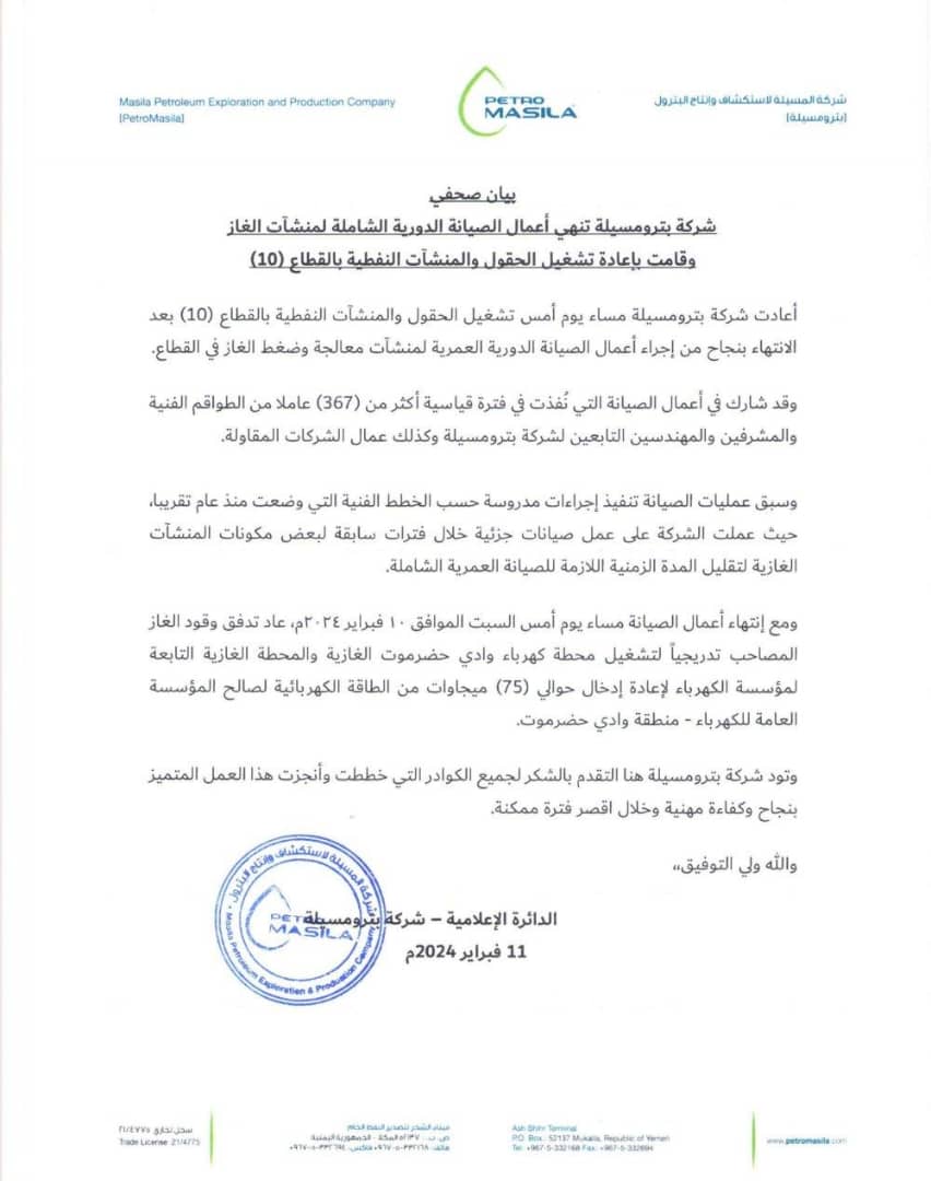 الرئيسية/الأخبار المحلية/بيان صحفي : شركة بترومسيلة تنهي اعمال الصيانه الدوريه لمنشآت الغاز وقامت بإعادة تشغيل الحقول والمنشآت النفطيه بالقطاع (١٠) بيان صحفي : شركة بترومسيلة تنهي اعمال الصيانه الدوريه لمنشآت الغاز وقامت بإعادة تشغيل الحقول والمنشآت النفطيه بالقطاع (١٠)