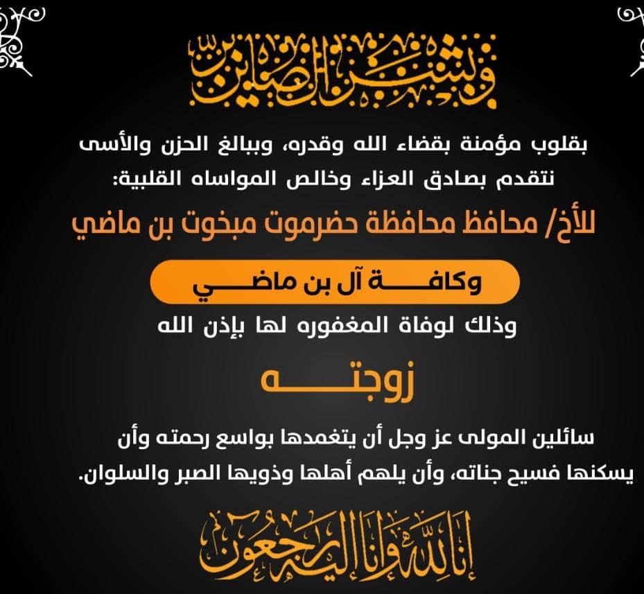 بعث معالي وزير النفط والمعادن ، الدكتور سعيد سليمان الشماسي ، برقية عزاء ومواساة إلى محافظ حضرموت مبخوت مبارك بن ماضي، في وفاة زوجته، التي انتقلت إلى جوار ربها، اليوم السبت، في العاصمة السعودية الرياض.