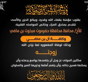 وعبّر وزير النفط والمعادن في البرقية عن خالص تعازيه وعظيم مواساته للمحافظ بن ماضي، وأبنائه وأفراد أسرة الفقيدة وذويها كافة، ومشاطرته لهم أحزانهم بهذا المُصاب الأليم.